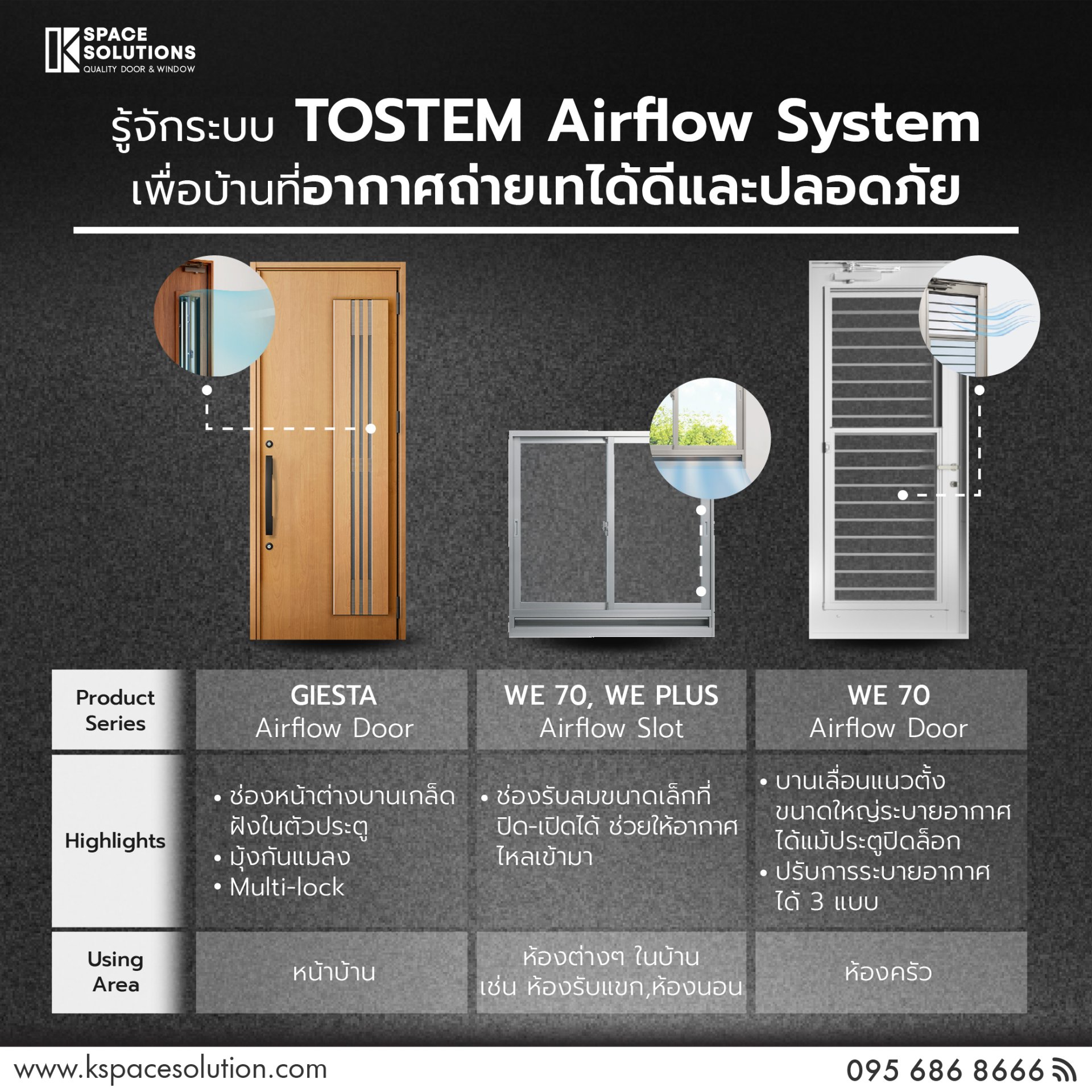 "ในสภาพอากาศร้อนชื้นอย่างเมืองไทย ถ้าจะมีประตูหรือหน้าต่างดีๆสักบาน ที่ถูกออกแบบมาเพื่อการระบายอากาศแม้ว่าจะปิดอยู่ และที่สำคัญยังมีระบบล็อคที่แน่นหนา คงต้องยกให้กับประตูหน้าต่างในกลุ่ม TOSTEM Airflow System นอกจากจะมีคุณสมบัติข้างต้นแล้ว รอบบานประตูยังมียางทนความร้อนที่ทนทานต่อแรงดันลม, ช่วยกันเสียงรบกวนจากภายนอก และยังช่วยเพิ่มประสิทธิภาพของการป้องกันน้ำอีกด้วย เดี๋ยวเราไปดูกันว่าจะมีสินค้าตัวไหนบ้างที่น่าสนใจ"