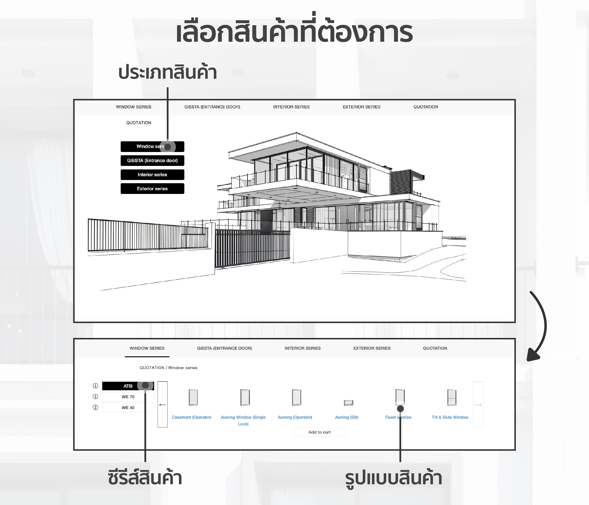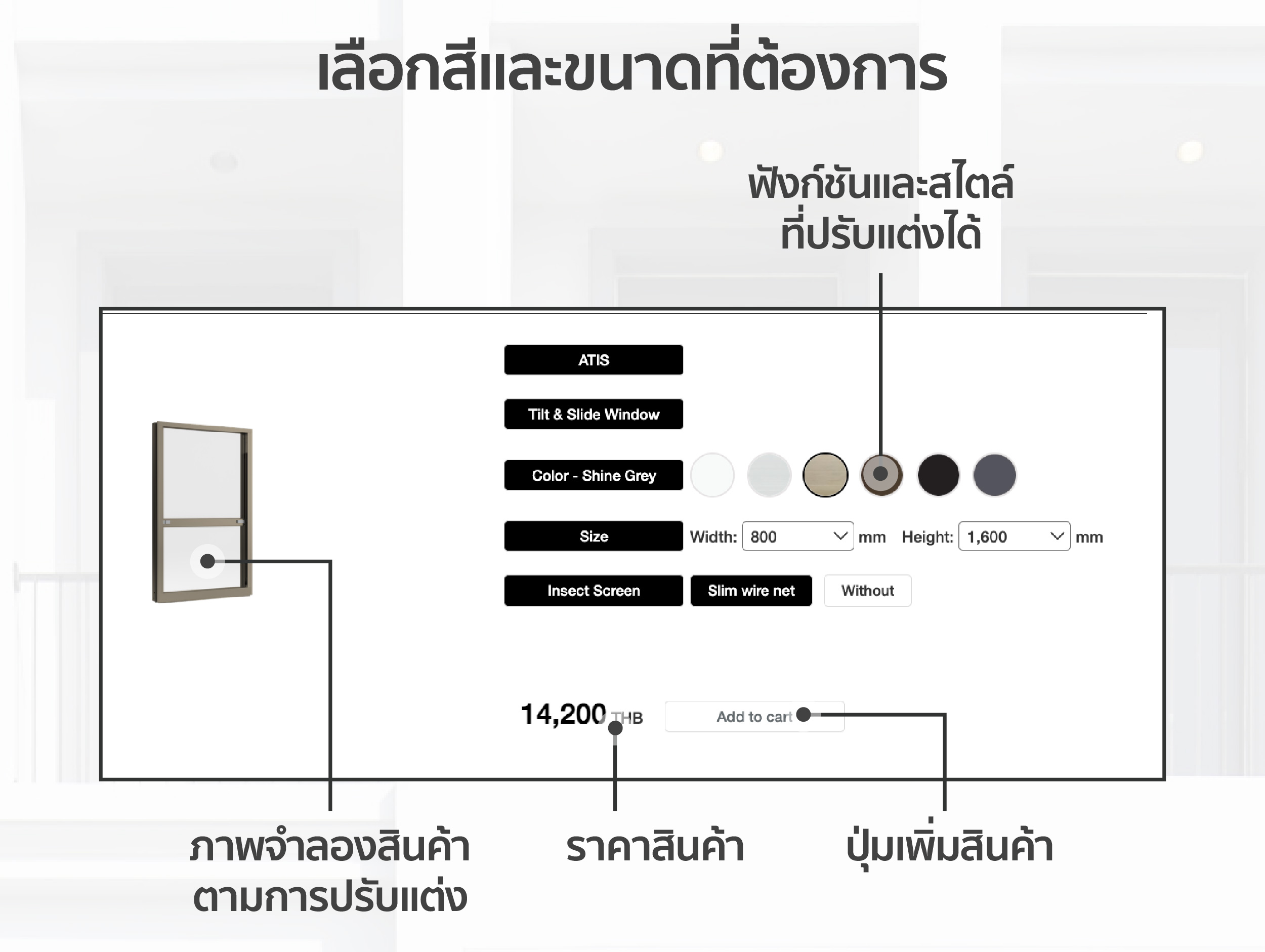 เลือกสี ขนาด และฟังก์ชันของสินค้าตามความต้องการ สำหรับสินค้า “หน้าต่างบานยก ATIS” จะสามารถเลือกได้ดังนี้