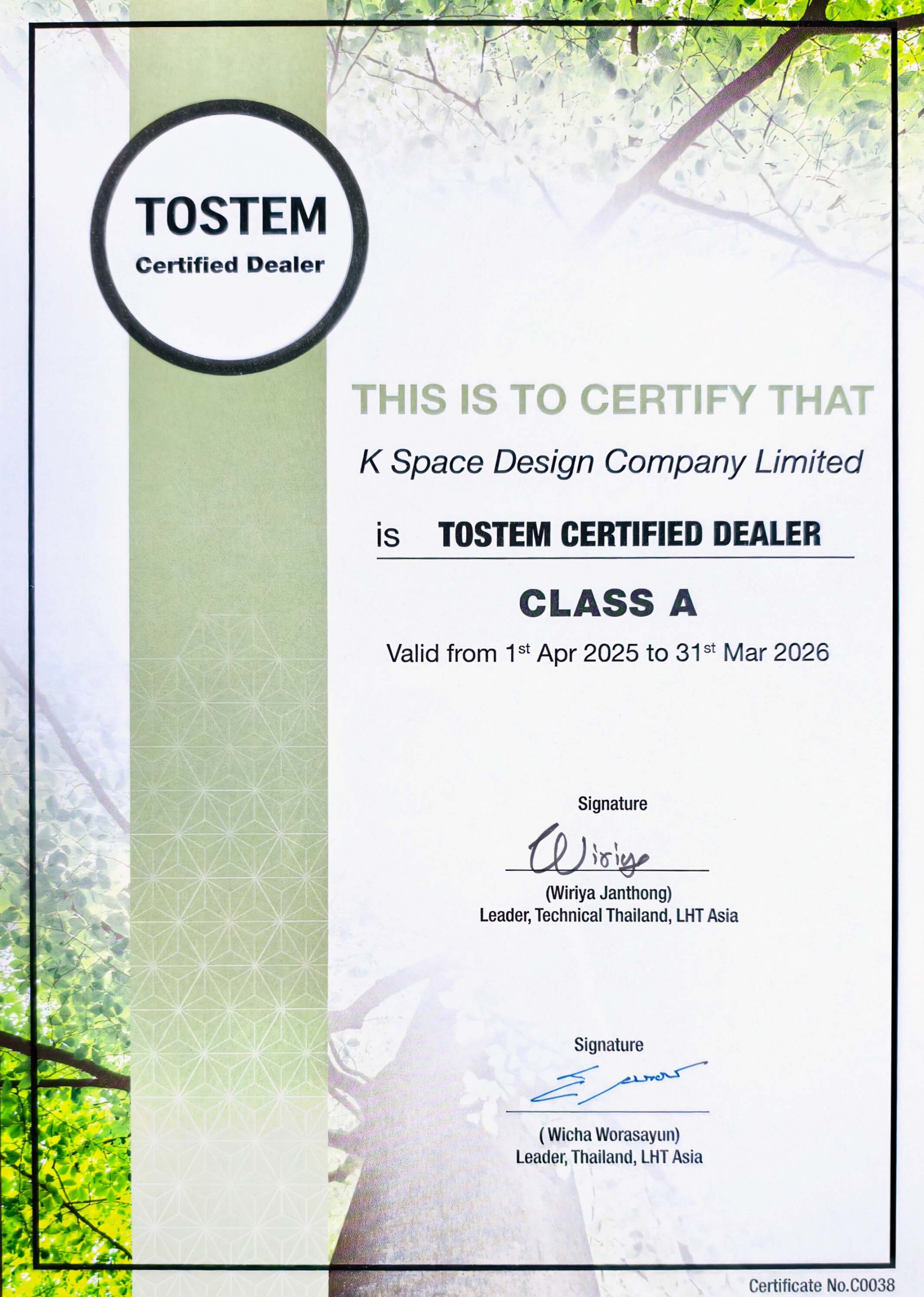 บริษัท เค สเปช โซลูชั่น จำกัด ผ่านการรับรองการเป็นตัวแทนจำหน่ายของ TOSTEM อย่างเป็นทางการ มีผลงานการติดตั้งมาแล้วมากมาย เพราะเราคือผู้เชี่ยวชาญ งานติดตั้งประตูหน้าต่างคุณภาพสูงโดยทีมช่างมืออาชีพมากประสบการณ์ ที่ผ่านการอบรมอย่างสม่ำเสมอ พร้อมใส่ใจ และให้คำแนะนำทุกขั้นตอนเพื่อความพึงพอใจสูงสุดของลูกค้า